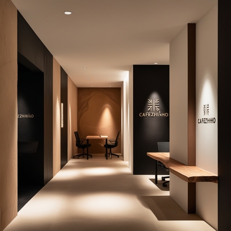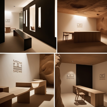 /imagine prompt for the office inside: Generate a design for the office inside coffee brand Cafezhinho inspired by cave paintings in a minimalist style using black white brown beige colors. Make it detailed and stylish.