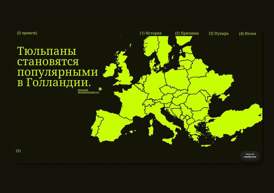 Сайт начинается с исторической справки, которая вводит в основное положение дел в мире. При скролле объекты довольно быстро появляются на экране, что символизирует скорость распространения тюльпанов.