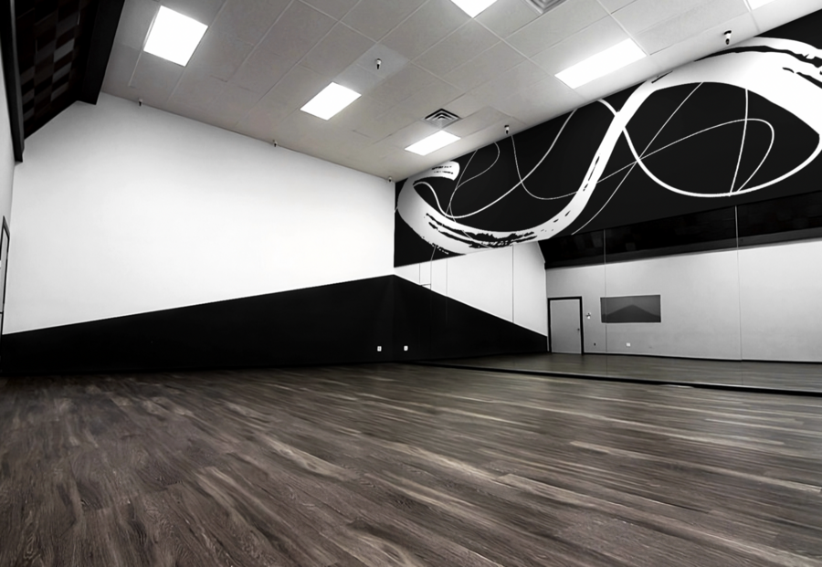 Попытка генерации зала для занятий тоже получилась успешной, не точь в точь, но в нужном направлении. (generate a dance school gym with black walls on which white smooth lines are drawn, repeating the silhouette of the letter S)