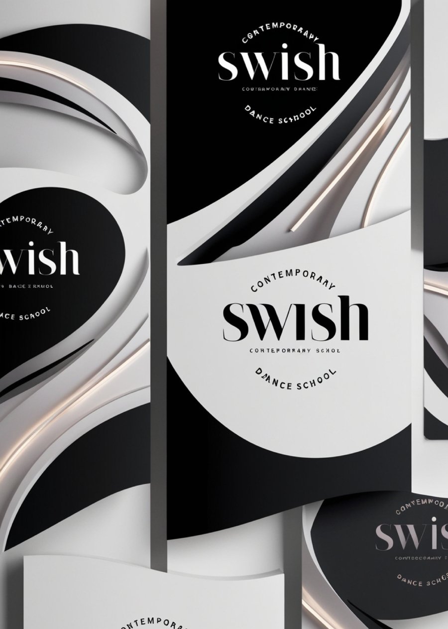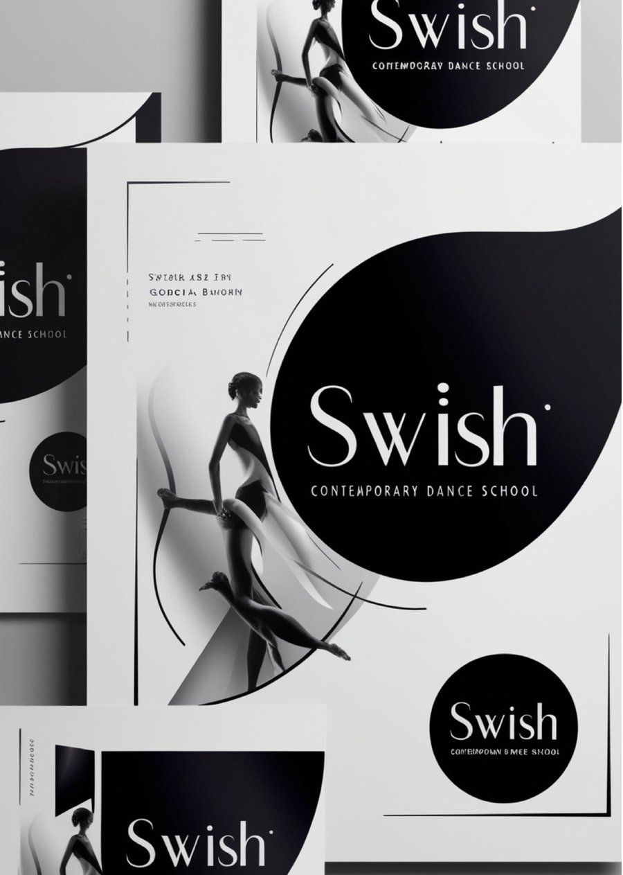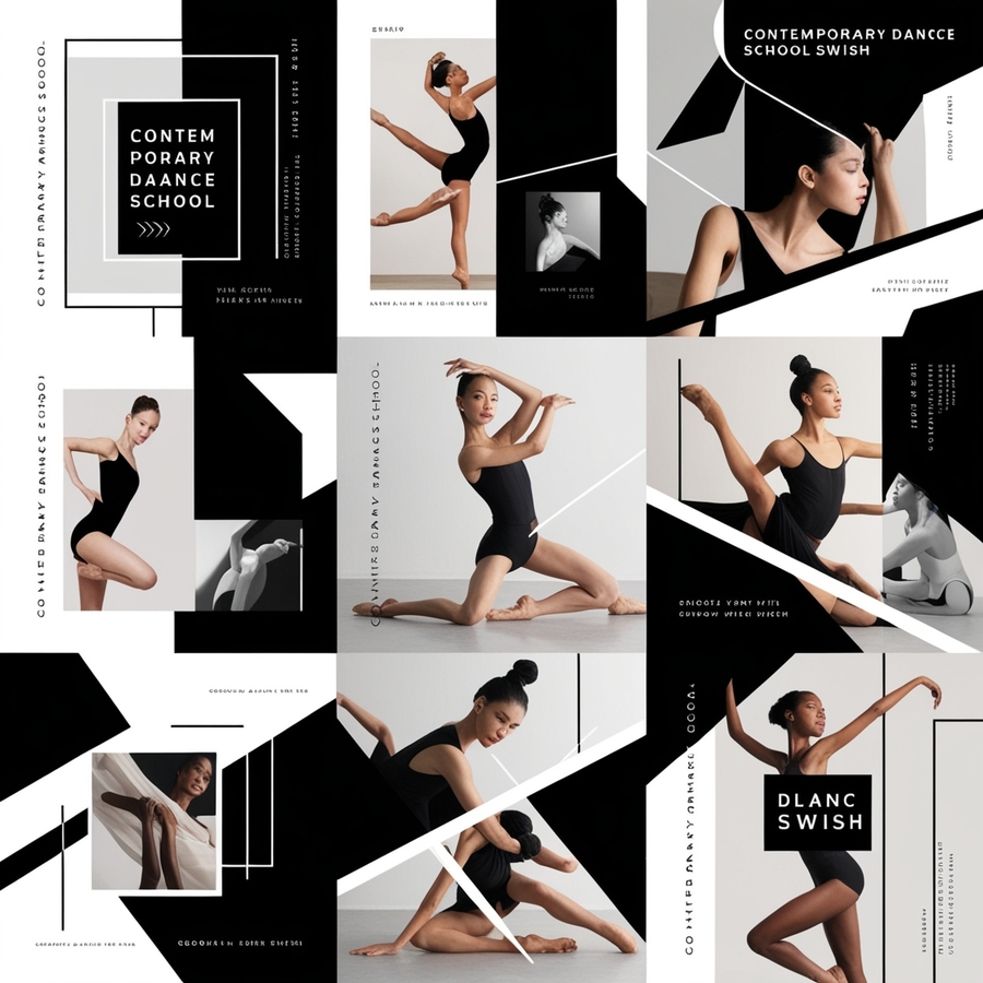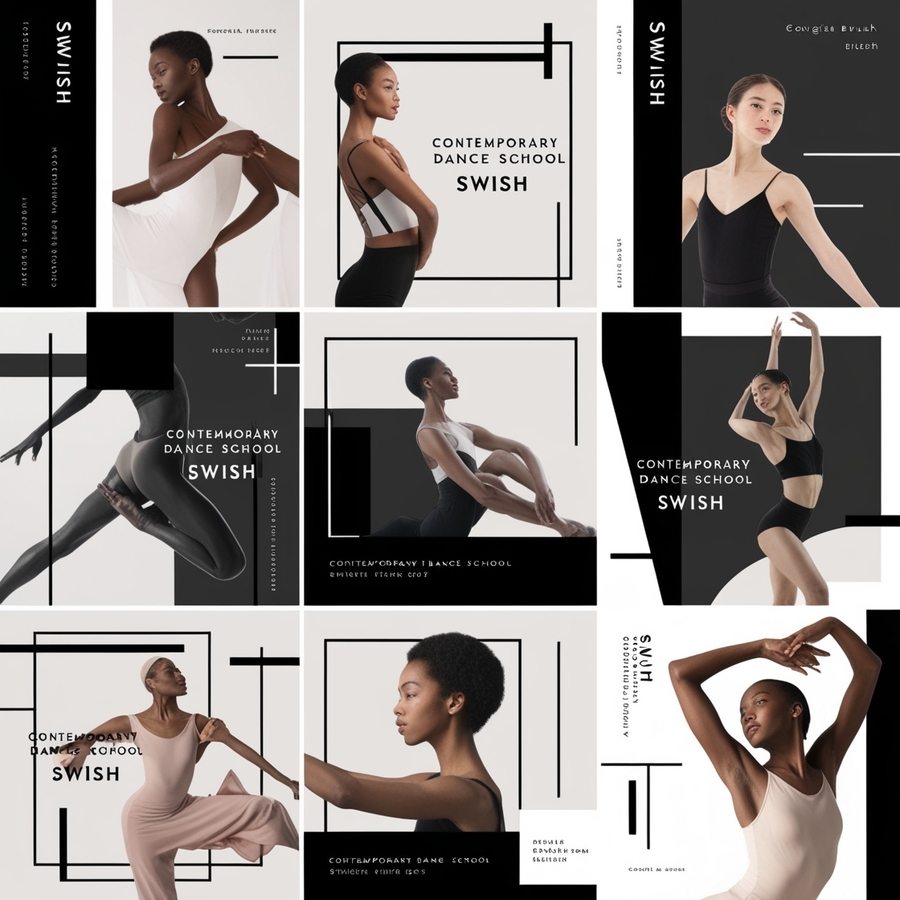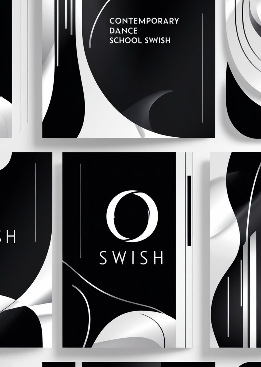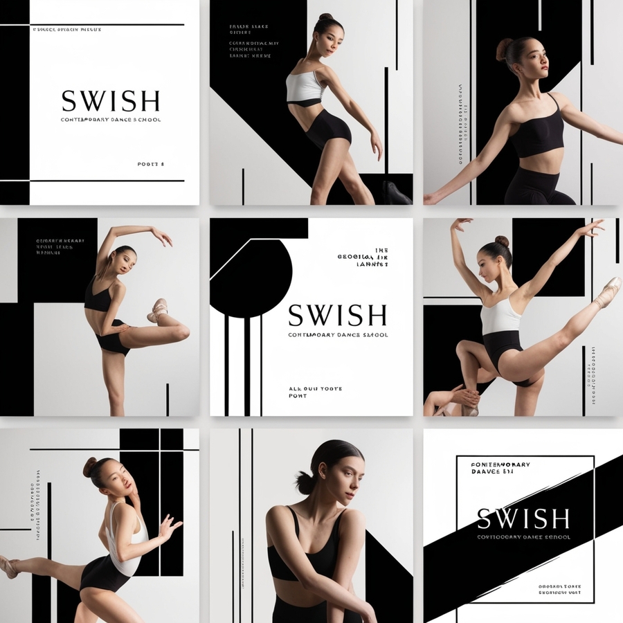Варианты постов, генерированы в леонардо.аи (Create a series of social media posts for the «contemporary dance school SWISH» featuring a cohesive visual identity, characterized by a striking black and white color scheme, smooth lines, and geometric shapes, evoking a sense of elegance and modernity. Incorporate the Georgia brush font to add a touch of sophistication and creativity. The use of narrow lighting and subtle shadows adds depth and dimensionality to the overall design. The composition should be clean and minimalist, allowing the viewer’s focus to be drawn to the dancers' movements and expressions. Include a mix of dramatic poses, flowing movements, and candid moments to capture the energy and emotion of contemporary dance. Dancers should be depicted with soft, natural skin tones, and their facial features should be subtle yet expressive. Text overlays should be used sparingly, ensuring the typography is clear and easy to read, while also blending seamlessly with the overall aesthetic.)