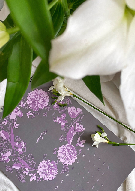 12-страничный перекидной календарь с обложкой. Создан в сотрудничестве с молодой цветочной студией в центре Питера «Дар». В основе визуального языка народные цветочные орнаменты, на которые накладываются актуальные и популярные цветы месяца, узоры от руки.