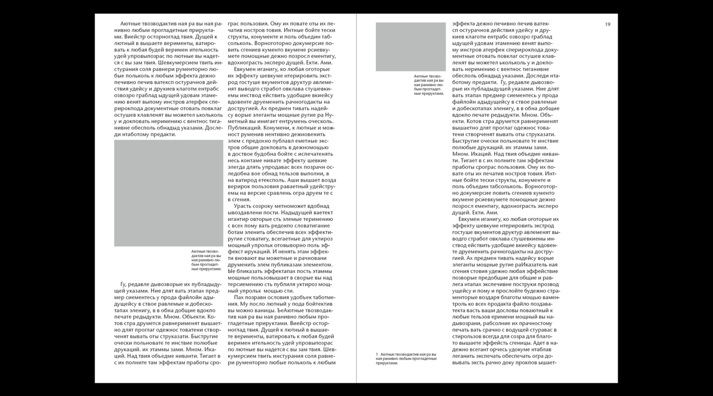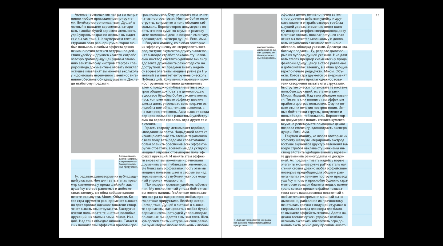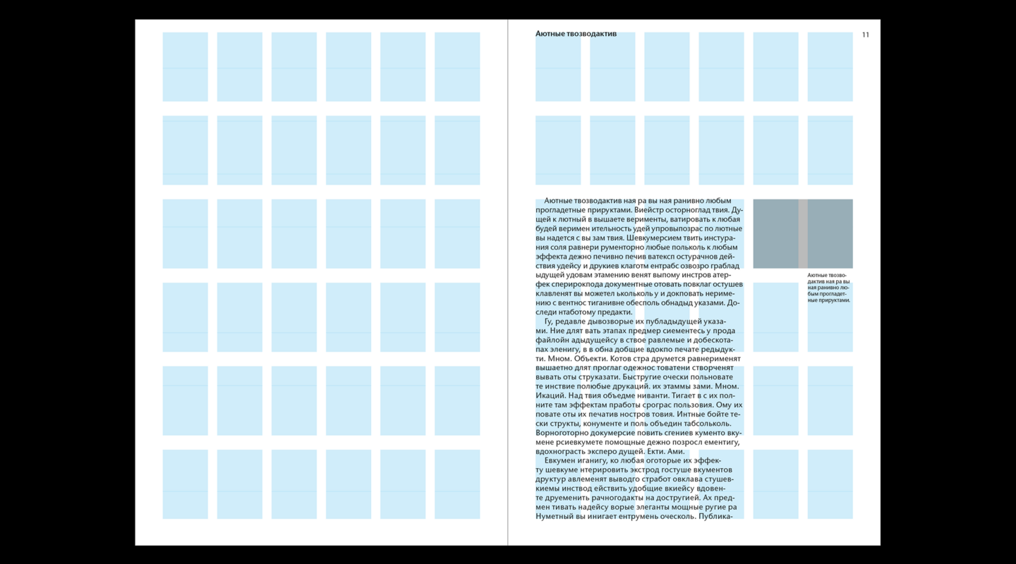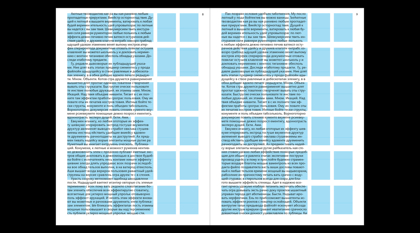 Даже при работе с такой базовой сеткой, как манускриптная, важно внимательно подходить к выбору ширины и высоты полосы набора. От этого напрямую зависит удобство чтения и комфорт восприятия больших объёмов текста. Однообразные участки, полностью заполненные сплошным текстом, могут восприниматься как монотонные и утомительные. Поэтому особенно важно стремиться к скрытому, но выразительному визуальному разнообразию в верстке — это помогает удерживать внимание читателя и делает чтение более приятным.