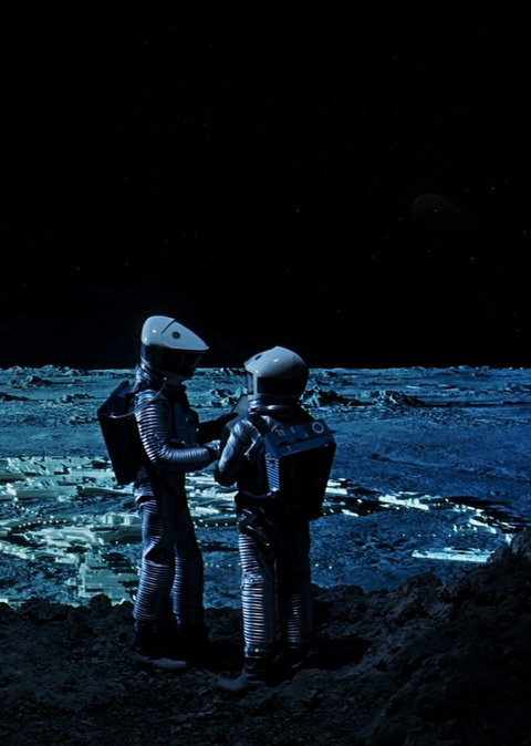 Перенесемся в Эпизод 2: Лунное путешествие в 2000 году. Такими Кубрик видит костюмы космонавтов на стыке веков. Из примечательных деталей — все скафандры выполнены в серебристых и золотытсых цветах, что скорее напоминает нам инопланетные оттенки.