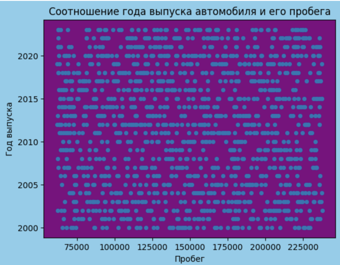 Предположили, что пробег может зависеть от года выпуска автомобиля, однако в данном случае линейной зависимости также не было найдено: