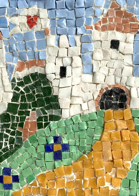 В этом проекте я осваивала навыки создания мозаики от эскиза до готового изделия. Мной были пройдены разные этапы создания мозаики: от колки модулей и их обточки до затирки швов. Результатом стали два изделия: мозаика из смальты (пейзаж со средневековым замком) и мозаичный номерок для квартиры