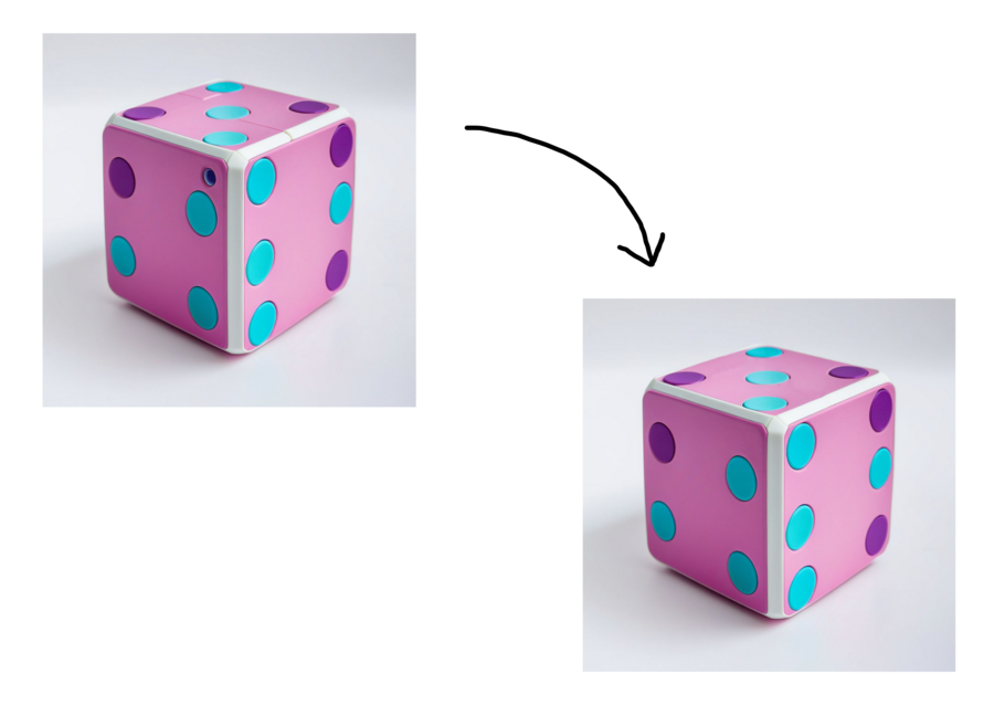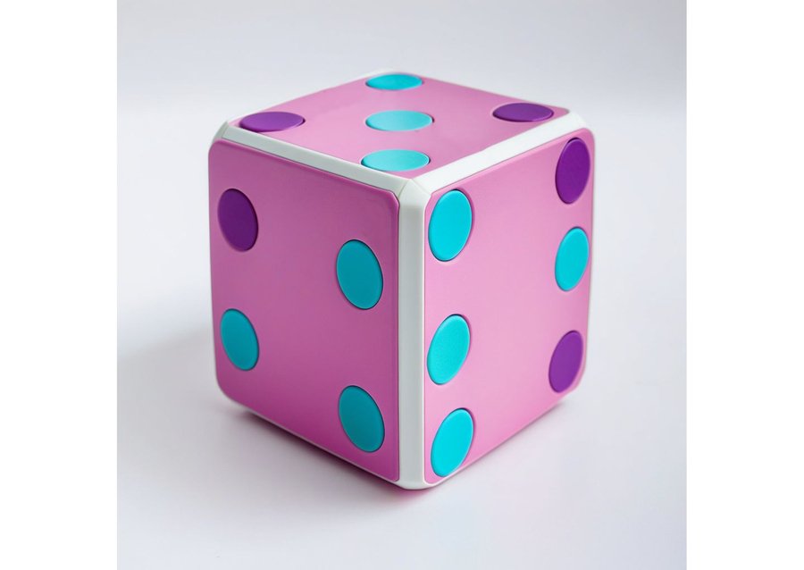 Для первого изображения я использовала нейросеть playground.com. Промт: pink game cube with crimson, purple and turquoise dots. White background at the back. Фильтр: Realism Engine Также для постобработки и удаления ненужных частей, я использовала Adobe Photoshop.