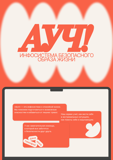 «Ауч!» — это инфосистема безопасного образа жизни. Мы представляем альтернативу скучным учениям о безопаности и подаем информацию в увлекательном виде. Наш сервис будет полезен как ученикам, проходящим курс ОБЖ, так и путешественникам, часто попадающим в трудные ситуации.