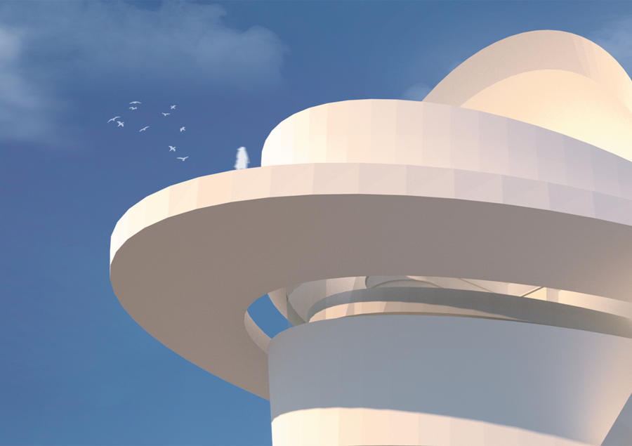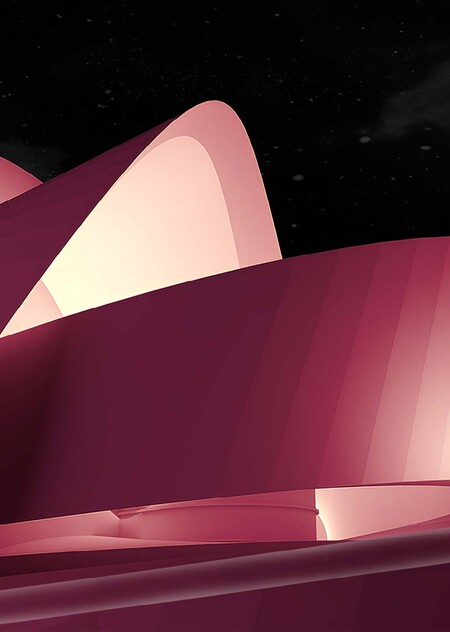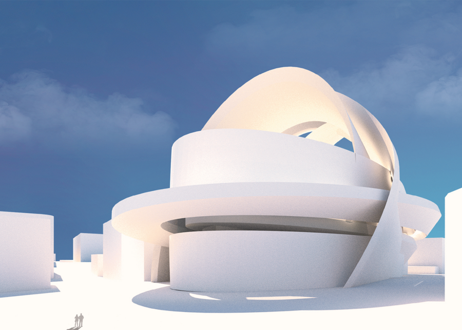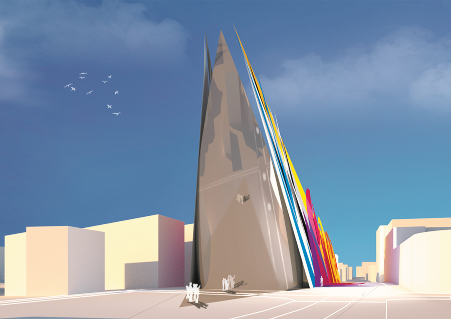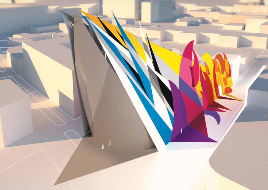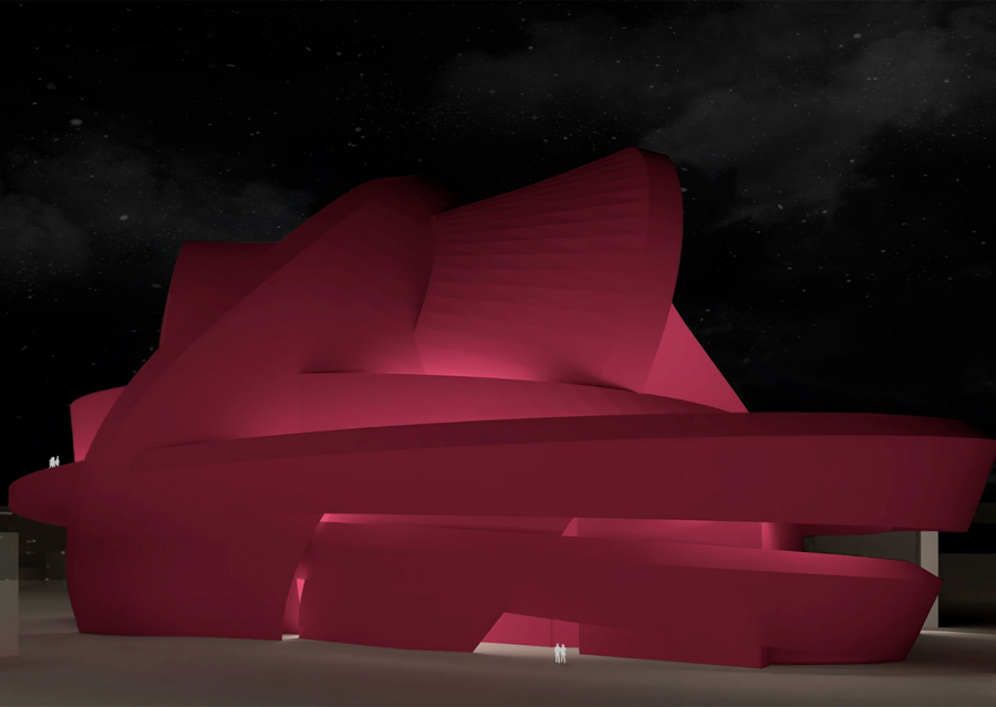 Фасад, выполненный в виде серии переплетенных лент, создает иллюзию непрерывного движения, отражая ключевую идею футуризма — покорение времени и пространства. Этот эффект усиливается использованием белой ткани как основы для фасада, превращая здание в живой холст, готовый принять на себя любые цвета и формы.