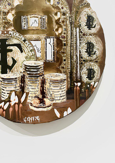 В своей первой картине «Вера в невидимое» я исследую параллели между биткоинами и религиозной верой, создавая образ, где биткоины расположены на алтаре, окруженные свечами.