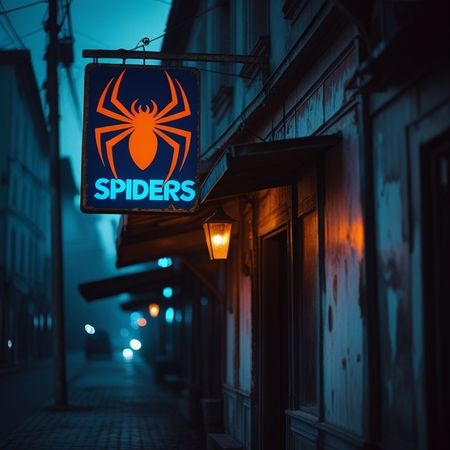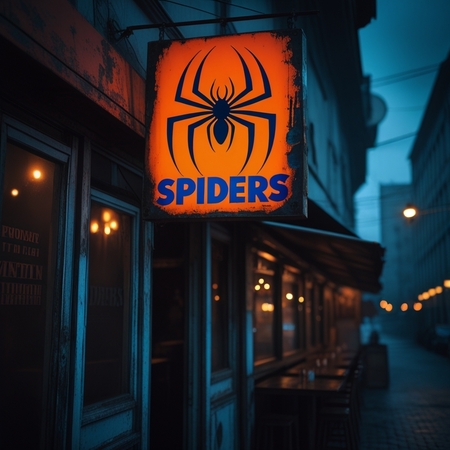 promt: logo of the horror restaurant spider with the text «SPIDERS» blue palette letters bright orange. horror restaurant with spiders. street side restaurant