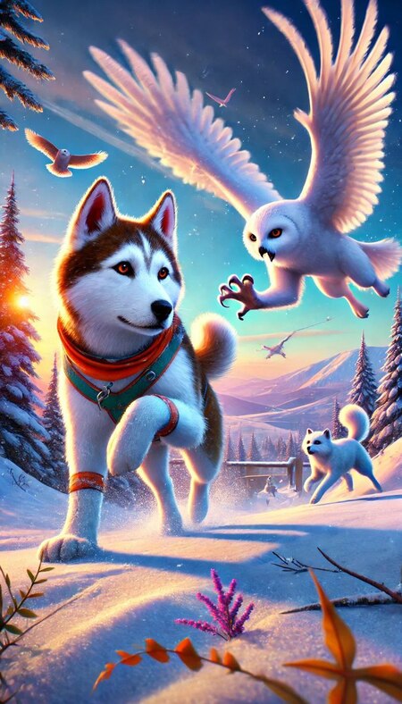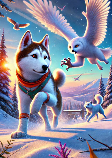 Prompt: videogame poster, semirealism, dog huski, white and brown wool, orange collar, scared, running in snow, a snowy owl attacks from behind, the white arctic fox also attacks, dog reaching towards them, dog looks around with fear and aggression, growls, mountains in the distance, dynamic pose, the sun is shining brightly, sunset, coniferous trees, illustration, concept art, hyperdetailed, atmospheric, cinematic composition, vibrant and cool colors