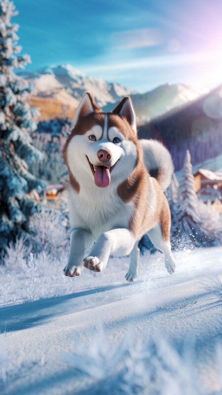 Prompt: videogame poster, semirealism, dog huski, white and brown wool, snow, running, happy with tongue, running in snow, mountains in the distance, dynamic pose, the sun is shining brightly, clear day, coniferous trees, the village in the distance, illustration, concept art, hyperdetailed, atmospheric, matte, cinematic composition, calm and cool colors