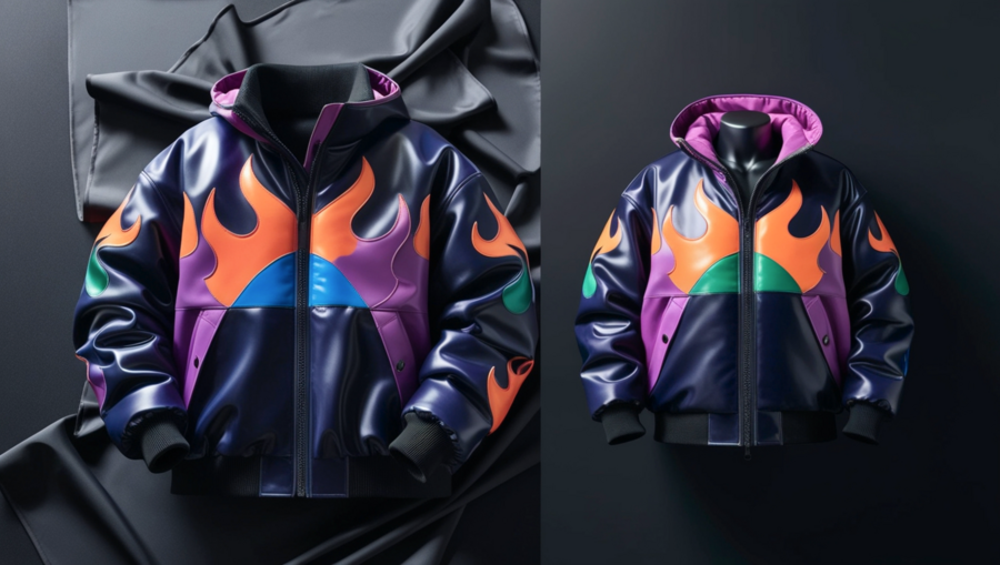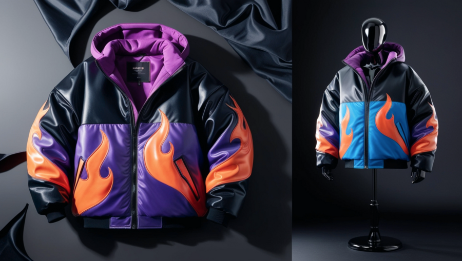 3D product shot: Two ENERGO oversized, flame-design jackets. One draped, one on a glossy dark mannequin, dark seamless background. Robust, dark fabric with vibrant colors. High-fashion, minimalistic.