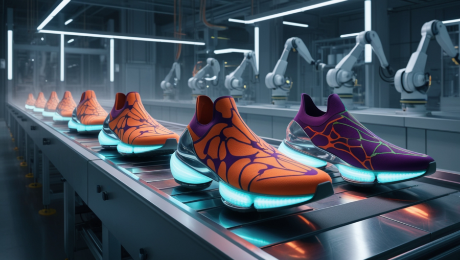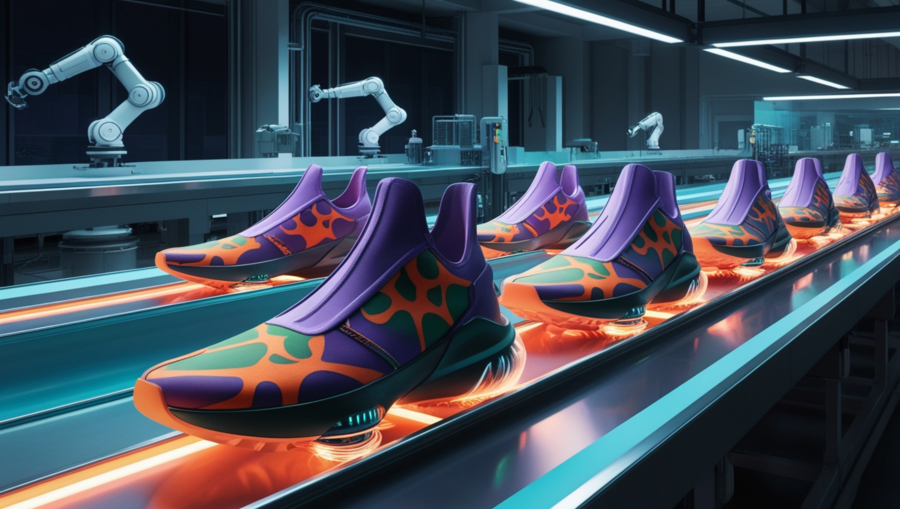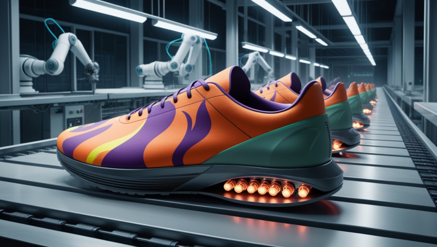 Модель: Phoenix 1.0 Preset Style: 3D Render Промпт: 3D visualization: Energo sneaker production line — a futuristic factory at night with a conveyor belt. Minimalist ENERGO sneakers feature simple, geometric flame patterns in orange, purple, and green, avoiding a painterly look. Glowing micro-turbine engines are visible on the soles. The factory is clean and automated, lit with cool ambient lighting. Focus is on the production process, the geometric flame pattern, and propulsion system. The overall aesthetic is high-tech and innovative, with dramatic lighting emphasizing the print and glowing engines.