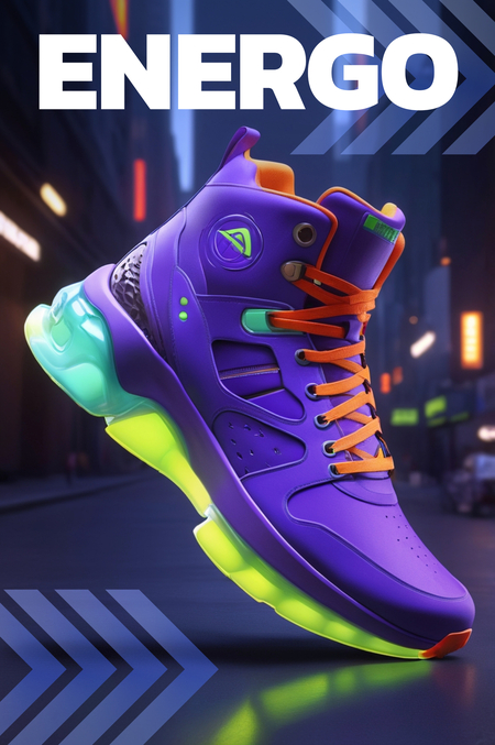 Модель: Phoenix 1.0 Preset Style: 3D Render Промпт: Generate two ENERGO magazine spreads on dark gray: one horizontal, half-view, zoomed-in; the other vertical, full-view. Designs should be minimalist, dynamic, and innovative. Feature the ENERGO logo with a stylized «E» using colors #8538F2, #CAEA5C, and #F28D52. Typography must be clean and legible, conveying power and futuristic energy. Include high-quality ENERGO sneaker images with concise text, emphasizing brand colors and the dynamic logo.