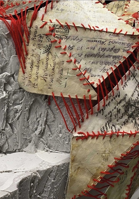 Нить появляется в проекте неслучайно. Военно‐полевую почту часто называли единственной связующей нитью между фронтом и тылом. Красный цвет тоже выбран осознанно, он считается самым сильным из всех возможных оттенков. Люди верят, красная нить способна охранять не только человека, но и вообще все, что составляет его окружение. Многие носят красную нить как оберег, некоторые повязывают её на все, что им дорого. Так и дорогие сердцу и душе письма сшиты именно красной шерстяной нитью.