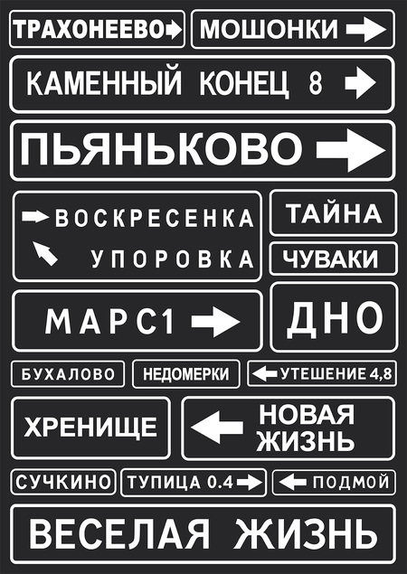 Календарь, посвященный странным и смешным названиям городов и деревень России. Проект призван не только развлечь, но и познакомить с культурным наследием и языковым богатством России, делая акцент на многообразие местных названий. За основной визуальный образ взяты дорожные таблички-обозначения поселений, демонстрирующие также уникальные шрифтовые особенности каждой из них.