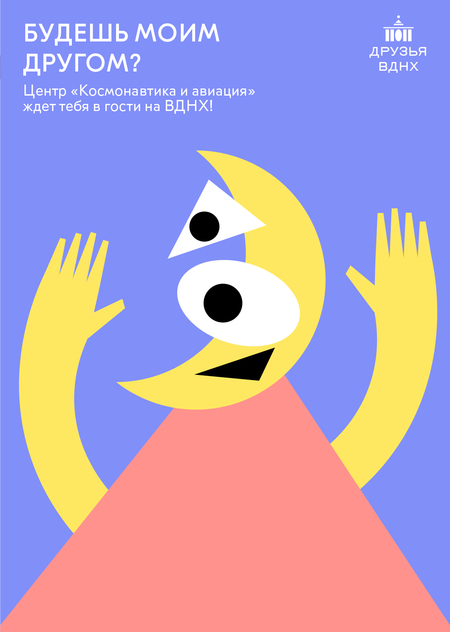 Экран разделяется на две части. На левой стороне один из павильонов ВДНХ грустно смотрит на меню в кафе, понимая, что для него это слишком дорого. На правой части второй павильон рассматривает пустую корзину для пикника. Между персонажами появляется третий павильон, который держит карту лояльности. Он машет ей, и магическим образом у первого появляется тарелка с едой, а у второго корзина, полная мерча. Все персонажи радостно улыбаются, держатся за руки, появляется текст «Станьте частью „Друзей ВДНХ“