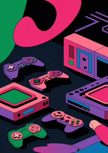 Нейросеть для генерации изображений: Ideogram Промпт для изображений: create a picture for a project about video games sales without text on it. the back ground must be dark. use vibrant colors such pink green purple and blue