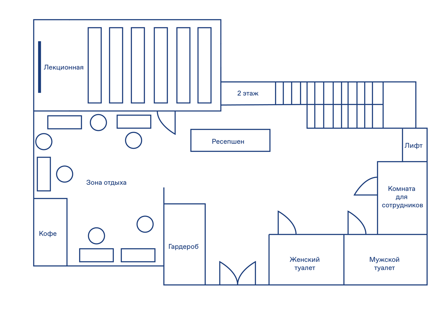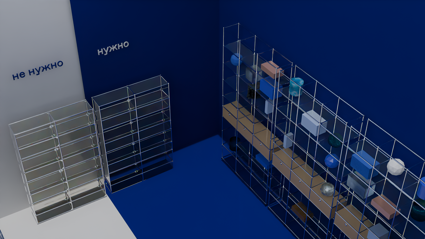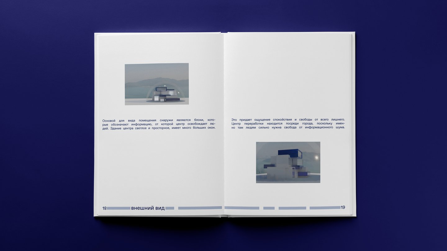 Основой для вида помещения являются блоки, которые обозначают информацию, от которой центр освобождает людей. Здание центра светлое и просторное, имеет много больших окон. Это придает ощущение спокойствия и свободы от всего лишнего.