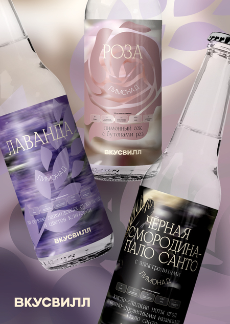 Айдентика призвана передавать нестандартность авторских вкусов новой линейки лимонадов Вкусвилла. Серия состоит из трех SKU: роза, лаванда, чёрная смородина-пало санто. Метафорой сложности вкусовой композиции лимонада является многослойность в дизайне: заблюренное изображение вкуса продукта, векторная иллюстрация и текстовое описание. А сдержанная цветовая палитра помогает передать натуральность продукта