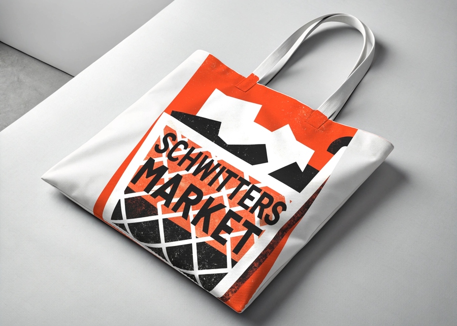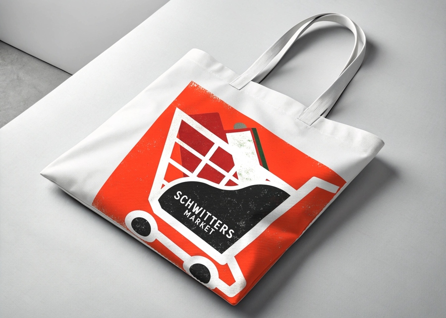 На первом шопере был нанесён логотип сгенерированный ранее, но для второго паттерна был использован отдельный промпт: Generate an illustration in the style of a paper collage showing a shopping cart with garbage with the inscription «Schwitters market»