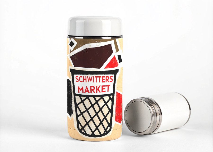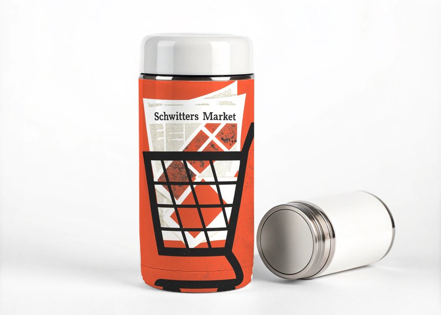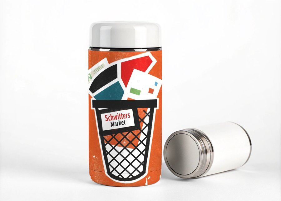 Промпт: Generate an illustration in the style of a paper collage showing a trash can with the inscription «Schwitters market»