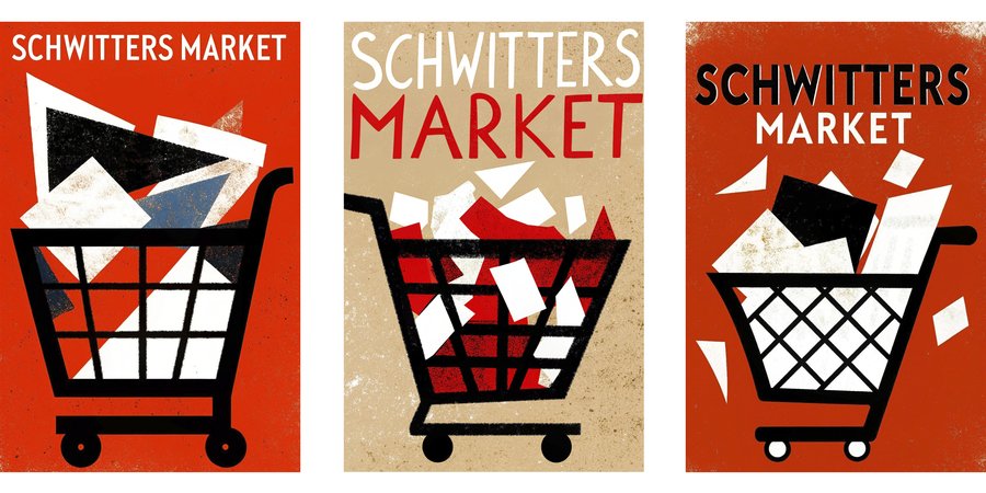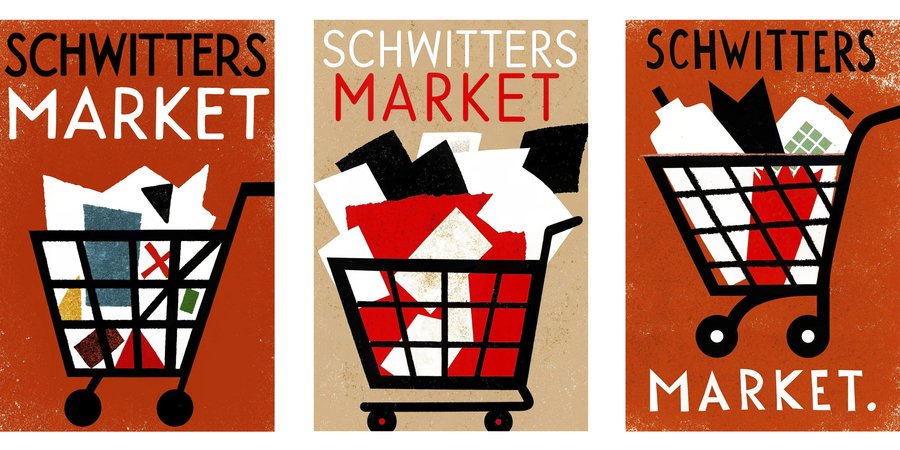 Промпт: Generate an illustration in the style of a paper collage showing a shopping cart with garbage with the inscription «Schwitters market»