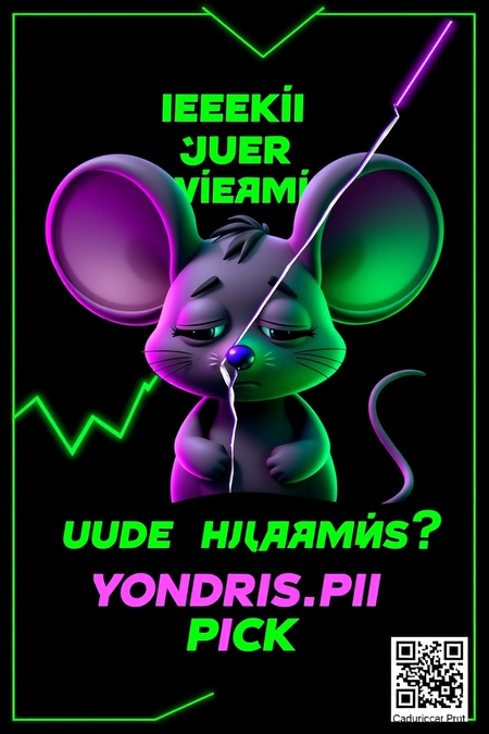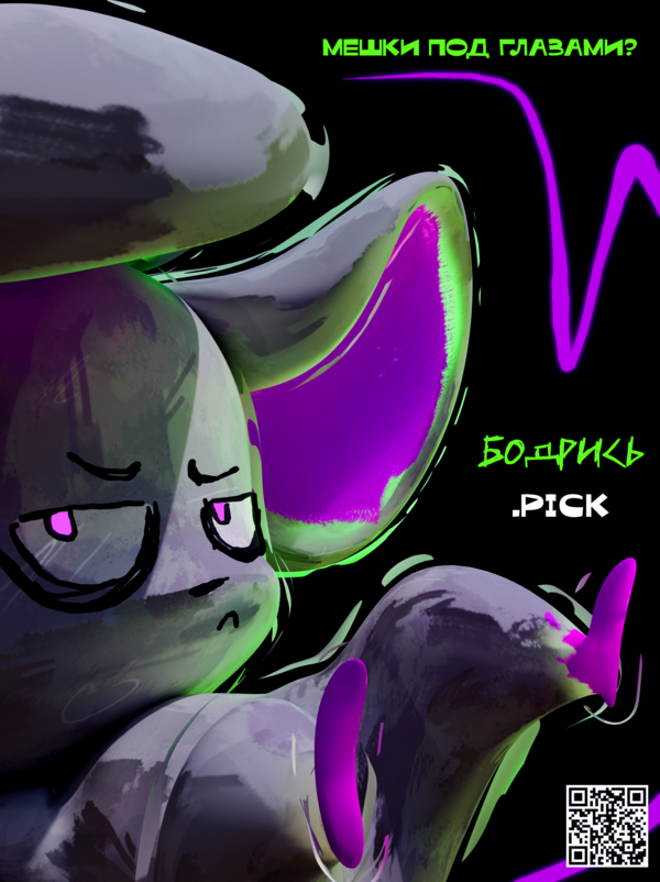 «A stylized digital poster featuring a moody cartoon character with large floppy ears glowing in neon purple and green hues. The character’s expression is tired and unimpressed, with half-closed, baggy eyes outlined in bold black. The background is black, accented by jagged, glowing neon green and purple lines, adding an energetic yet exhausted vibe. At the top, the text in bold green font reads: 'Мешки под глазами? ' Below, in a playful and futuristic style, the text says: 'Бодрись' followed by '.PICK.' A small QR code is positioned in the bottom-right corner, adding a modern and interactive element. The art style blends painterly shading with neon lighting, emphasizing the character’s glow and creating a mix of humor and sarcasm.»