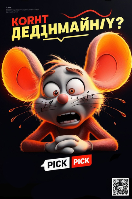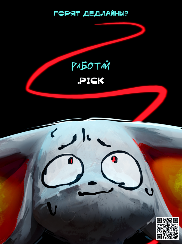 «A digital poster featuring a distressed cartoon character with large floppy ears glowing with vibrant orange and red hues. The character’s face shows nervousness and panic, with sweat drops and wide, anxious eyes outlined in black. The background is solid black with a dramatic red squiggly line resembling stress or urgency. Above the character, the text reads in a bold and stylized font: 'Горят дедлайны? ' Below it, a motivating phrase 'Работай' is written, followed by '.PICK' in a minimalistic and futuristic style. In the bottom-right corner, a small QR code adds a modern touch. The art style combines painterly shading with bold outlines, creating a mix of tension and humor.»