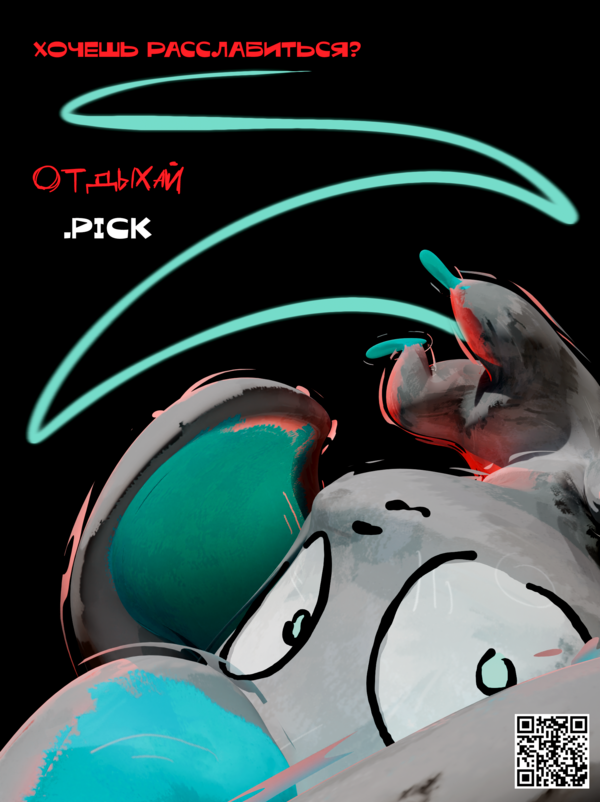 «Poster design with a playful and surreal style, featuring a close-up view of a cartoonish character with exaggerated, expressive features. The character has large, round eyes and teal-colored accents on its ears and nose, with a glossy, almost 3D-rendered texture. The character appears relaxed and slightly surprised, positioned in the bottom half of the frame, with its ears pointing upwards. The background is solid black, emphasizing the neon elements: a glowing, curved teal line resembling a wave or swoosh above the character. The text is written in bold, modern fonts in Russian: 'ХОЧЕШЬ РАССЛАБИТЬСЯ? ' (Do you want to relax?) in red at the top, followed by 'ОТДЫХАЙ .PICK' in a futuristic, glowing style. A small QR code is placed in the bottom right corner for added detail. The overall composition conveys a relaxed and futuristic vibe, blending humor with sleek design.»