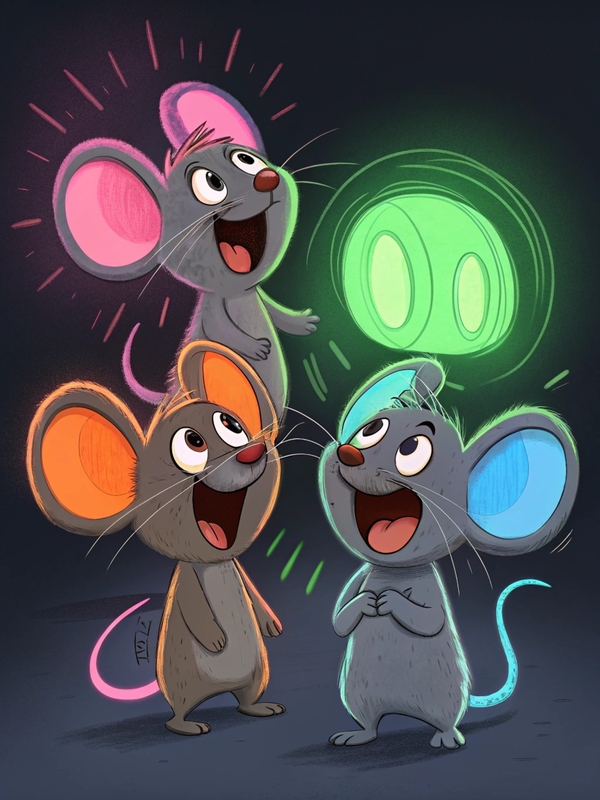 «Three collectible figurines designed as stylized cartoon mice with oversized ears and minimalistic features. Each figurine is made of polished, semi-transparent resin with a glossy finish. The ears are vibrant and colorful: one mouse has magenta ears, the second has orange ears, and the third has cyan ears. The bodies of the mice are smooth and metallic silver, with simple engraved eyes and a cheerful expression. The figurines are placed on small, round bases with a matte finish, matching the color of each mouse’s ears. The background is a soft gradient of white and light gray, emphasizing the sleek and modern look of the figurines. Subtle studio lighting creates realistic shadows and highlights.»
