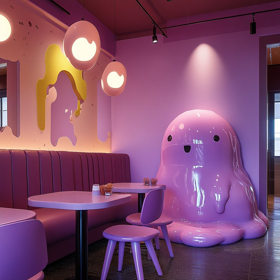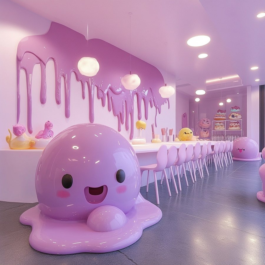 После этого я попыталась сгенерировать интерьер кафе (a cafe design, violet and pink colors, cute slime creature figure, fantasy —cref (ссылка на ранее сгенерированного слайма) —cw 0), но получила муссовый десерт.