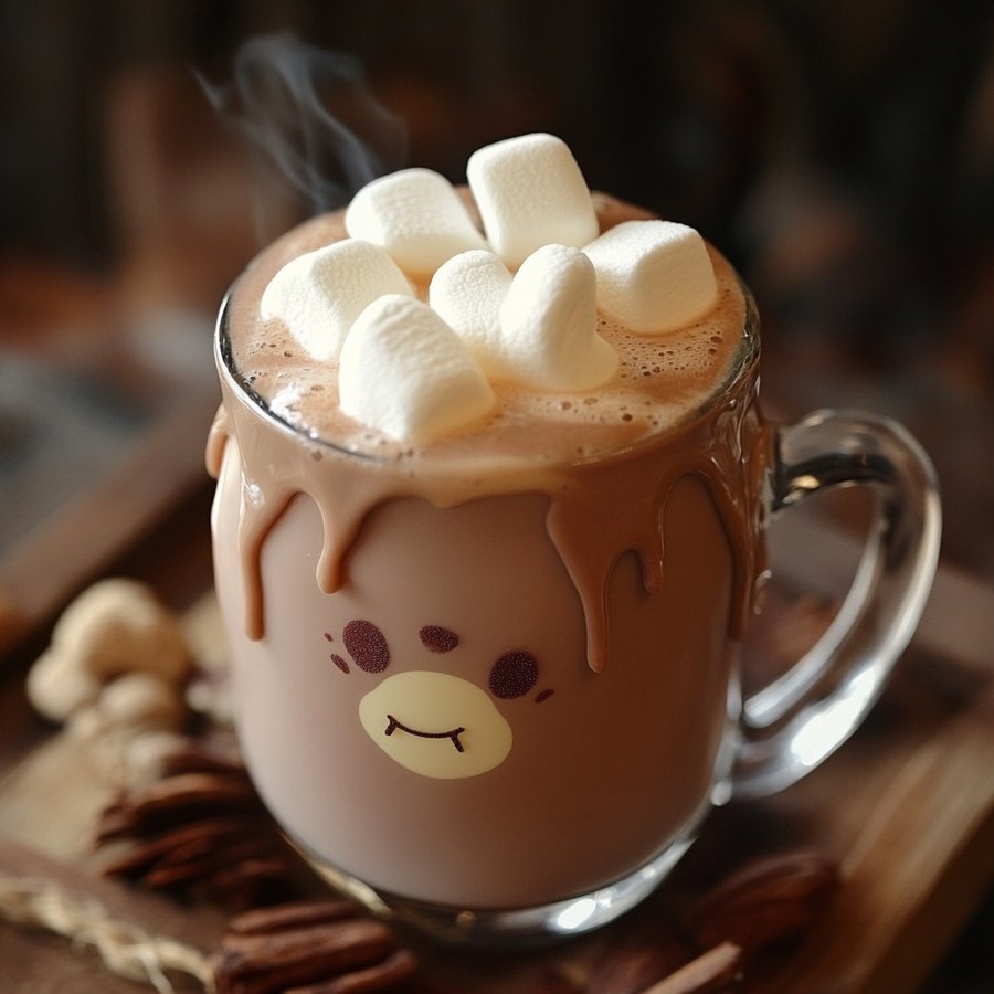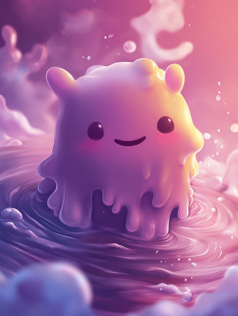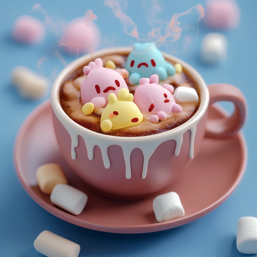 Поэтому я решила немного изменить формулировку промпта и сделать какао с маршмеллоу в виде слайма (cocoa drink with marshmallows in the form of little cute slime creature, fantasy —cref (ссылка на ранее сгенерированного слайма) —cw 0).