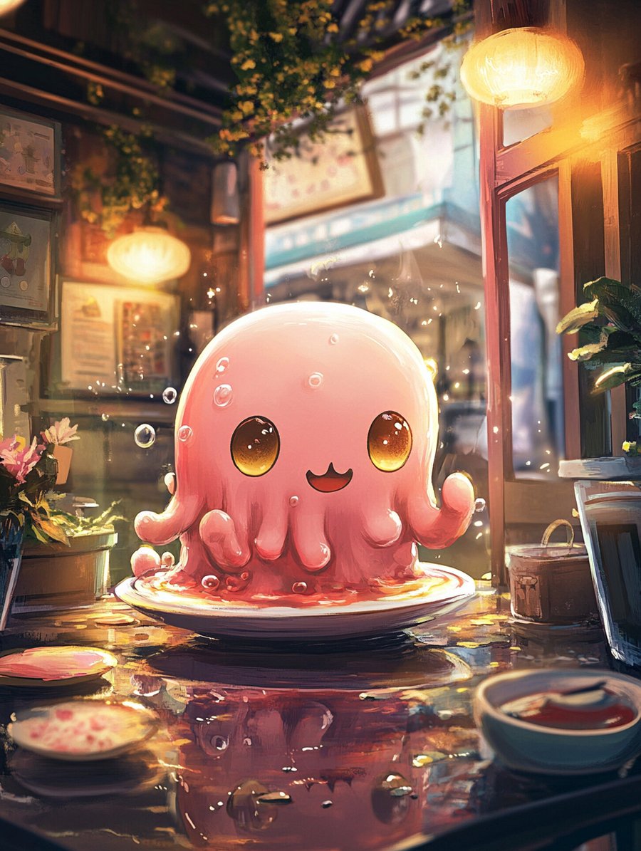 Маскотом кафе по прежнему является слайм. Он мягкий, гибкий, может принимать любую форму и менять цвета.