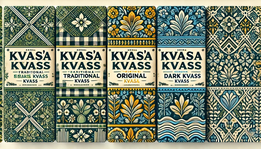 /imagine prompt: сreate three horizontal pattern variations for the kvass brand 'Kvassa' packaging. Each pattern represents a flavor with specific colors: green for traditional, yellow for original, and blue for dark kvass. The designs should be minimalist, culturally inspired, and visually cohesive, with a modern, clean aesthetic on a white background