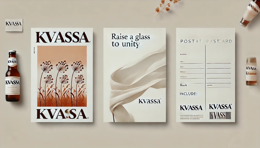 /imagine prompt: generate a mockup (horizontal image) of printed materials (paper, envelope, business cards) on a white background for the kvass brand 'Kvassa' that captures the essence of Russian culture in a fresh, sophisticated way. Focus on a clean, simple aesthetic, using the subtle image of a tablecloth blowing in the wind as a symbol of warmth, unity, and tradition. The design should be sleek and uncluttered, with understated cultural hints that feel relevant to a contemporary audience