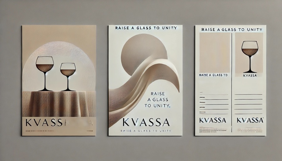 /imagine prompt: create a poster, minimalist design for the kvass brand 'Kvassa' that captures the essence of Russian culture in a fresh, sophisticated way. Focus on a clean, simple aesthetic, using the subtle image of a tablecloth blowing in the wind as a symbol of warmth, unity, and tradition. The design should be sleek and uncluttered, with understated cultural hints that feel relevant to a contemporary audience