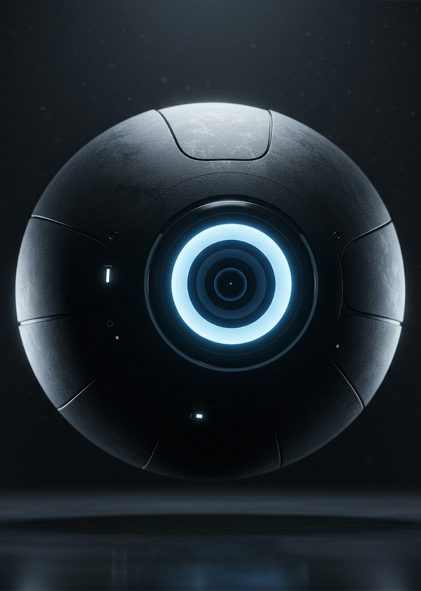 Промпт 1: Студийная съемка A futuristic spherical drone with a large central eye-like lens and a matte black body is hovering in the center of a minimalist white studio. A slow, smooth 360-degree orbiting shot reveals the drone’s design from all angles. Extreme close-up on the polished glass lens, reflecting the studio lights. The shot then pulls back to show the drone floating elegantly.