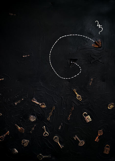 50 × 60 см Холст, акрил, масло, маркер, ключи, замки, ночная бабочка Smerinthus ocellatus 2018