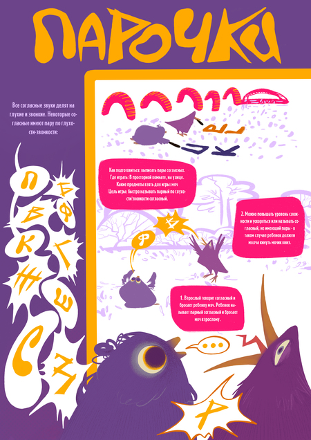 «Парочки» — это серия плакатов и карточек, разработанная для детей с дислексией и их родителей, чтобы сделать обучение чтению более увлекательным. Плакаты предлагают игру на запоминание глухих и звонких согласных и способы чтения с ребенком, а на карточках можно найти полезные термины. Работа была выполнена по брифу для центра обучения детей с дислексией «Верные слова».