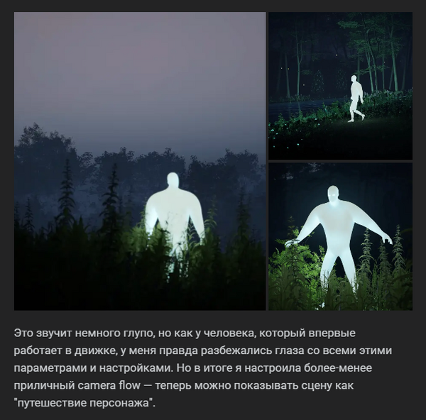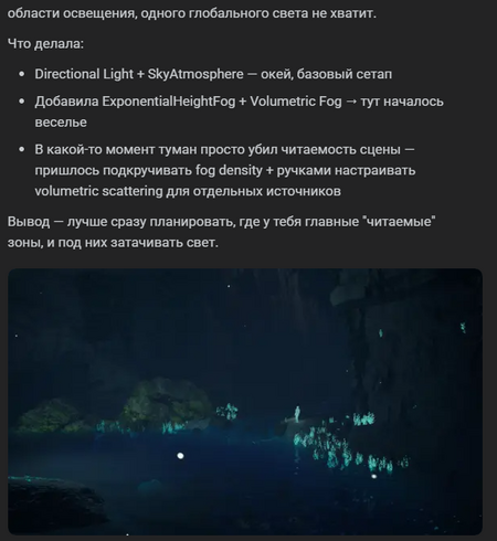 После этого статья ещё дорабатывалась. Я провела ещё больше обсуждений с ИИ о том, про что конкретно должна быть статья, и получилось вывести следующий скелет поста: -Вступление с историей «ожившего» учебного задания -Разбор технических этапов, с которыми были затруднения (настройка volumetric light, работа в camera sequencer’е) -Финал с вопросом к комьюнити и призывом к действию