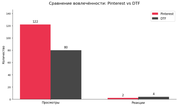 Chat GPT — генерация идей для статьи, анализ ЦА DTF, написание статьи, SEO-анализ, адаптация под SEO и интересы ЦА Perplexity — генерация идей для вертикального видео, создание плана монтажа, SEO-анализ, оформление и теги для Pinterest DeepSeek — интервью, дополнительный анализ конкурентов на DTF и Pinterest, подсказки по улучшению постов, помощь в написании кода для визуализации данных с помощью Pandas и Matplotlib Upscayl — увеличение качества некоторых изображений для лонгрида