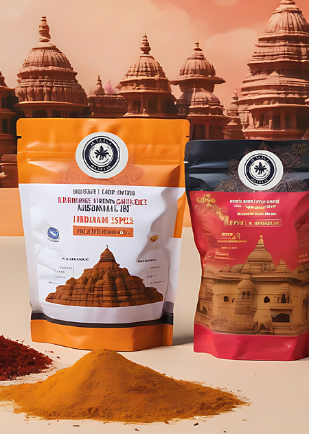 PROMT: 2 bright packages with Indian spices, which depict an Indian drawing against the background of Indian temples
