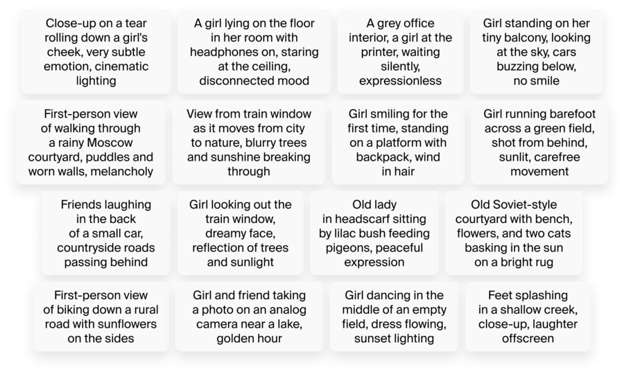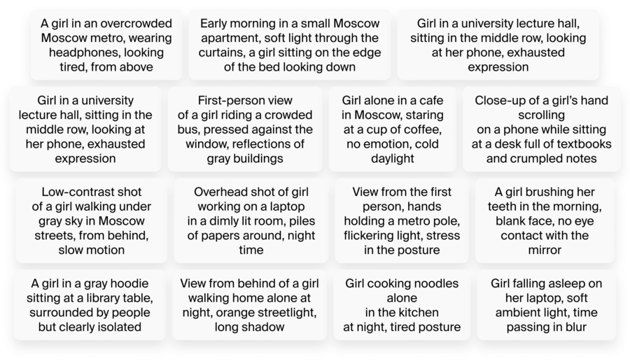 После этого ChatGPT прописал четкий сюжет, опираясь на этот ритм. Каждый клип был описан в виде промпта для генерации.