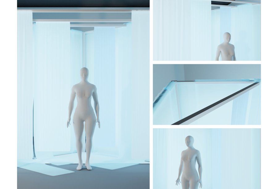 Пространство драпировано тканями голубых оттенков, через которые сочится свет, с потолка свисают полотна блестящей прозрачной ткани.
