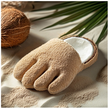 Выбрана рукавичка для массажа CocoScrub, так как: - Она напрямую дополняет скраб, усиливая эффект массажа и ухода. - Подчеркивает натуральность и экологичность (материалы: бамбуковое и кокосовое волокно). - Компактная, удобна для путешествий, соответствует тропической эстетике.