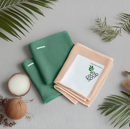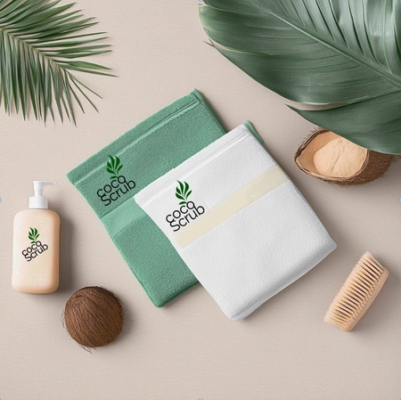 Логотип: Название бренда: CocoScrub. Шрифт: минималистичный, без засечек (например, Montserrat или аналогичный). Цвет логотипа: тёмно-зелёный (RGB: 0, 77, 64) или тёмно-коричневый (RGB: 87, 52, 29). Размещение: вышейте логотип в центре варежки (размер логотипа примерно 5×2 см). Декоративный узор: Небольшой элемент в виде кокоса или пальмового листа. Цвет узора: светло-зеленый (RGB: 108, 155, 125). Размещение: вышить в одном из углов рукавички (размер узора примерно 2×2 см). Текстура: Одна сторона рукавички должна быть слегка шероховатой (за счёт кокосового волокна) для скрабирующего эффекта, а другая сторона — мягкой (для массажа).