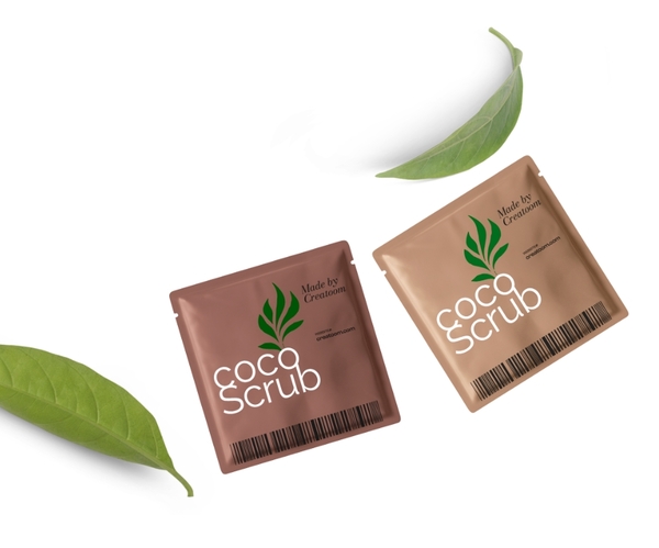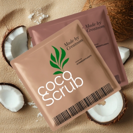 Упаковка Материал упаковки: Экологичная бумажная обертка (крафт-бумага). Цвет упаковки: Светло-бежевый (RGB: 238, 221, 195) или песочно-коричневый (RGB: 188, 138, 104). Дизайн упаковки: Логотип CocoScrub: темно-зеленый (RGB: 0, 77, 64) или темно-коричневый (RGB: 87, 52, 29), размер 6×3 см. Текст: «Массажная рукавичка CocoScrub. Нанесите скраб, помассируйте кожу круговыми движениями, смойте теплой водой». Шрифт текста: минималистичный, без засечек, размер 10 pt, цвет тёмно-коричневый (RGB: 87, 52, 29). Дополнительно: небольшой штамп в виде кокоса или пальмового листа, светло-зеленого цвета (RGB: 108, 155, 125).