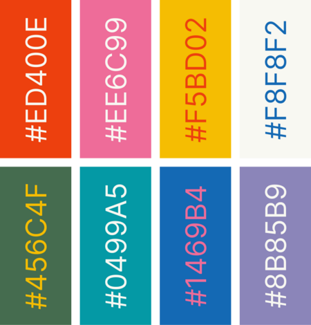 colors = [»#ED400E», «#EE6C99», «#F5BD02», «#456C4F», «#0499A5», «#1469B4», «#8B85B9»]